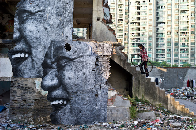 The inner city is often thought to be without hope and left unloved. Once upon a time, rampant tags by graffiti artists were thought to be signs of a derelict community, but recent years have seen the introduction of street art as a good thing. Artists pictured above, specifically Jana and JS, and JR [I promise I'm not obsessed with J's...except Jesus!] will use the walls of urban locations as a canvas. I really love the first picture by Jana and JS with the girl sitting in the window. As a girl with a thing for windows, I love that the graphic is a painted scene of something realistic.